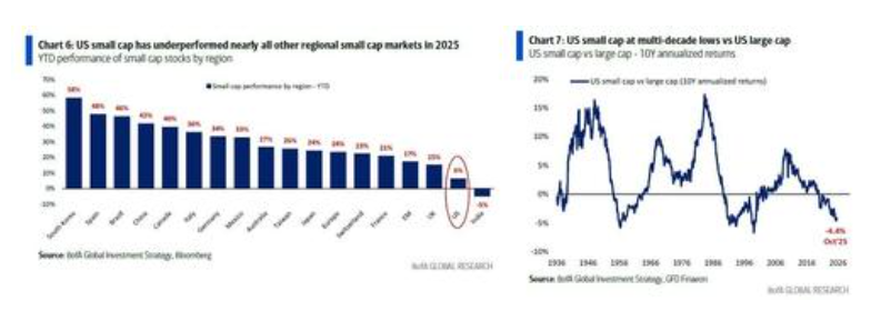 同时,美国中小盘股在2025年表现落后,其估值(14倍市盈率)远低于标普500指数(23倍市盈率),存在补涨空间。