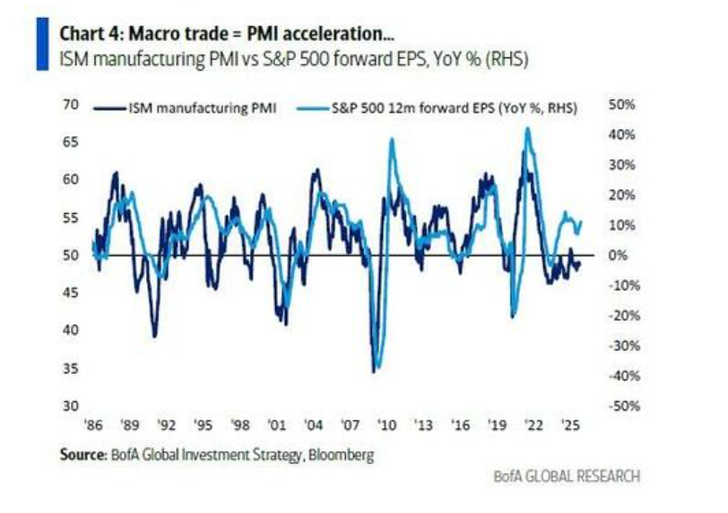 除了风险警告,Hartnett也指出了宏观层面的交易机会。他认为,减税、降息以及美国的产业回流政策,将推动采购经理人指数(PMI)加速升向55的扩张区间。