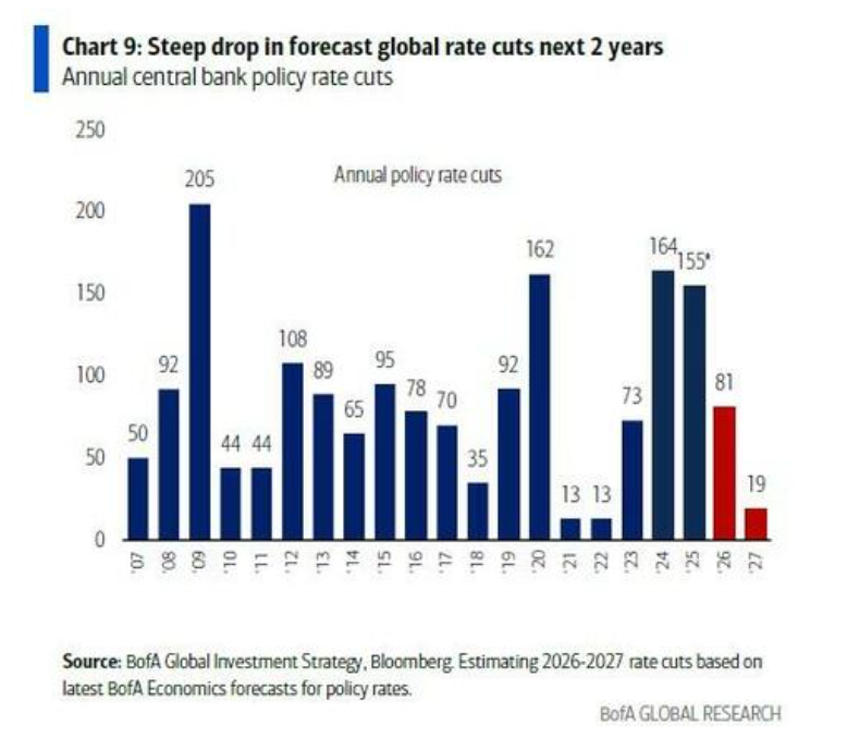 Hartnett的观点基于一个核心判断:支撑AI热潮的宽松金融环境正迎来拐点。尽管过去12个月全球央行进行了167次降息,但预计未来一年降息次数将锐减至81次。这种流动性势头的减弱,意味着信贷利差的最低点已经过去,而这对于需要巨额融资的行业来说并非好消息。