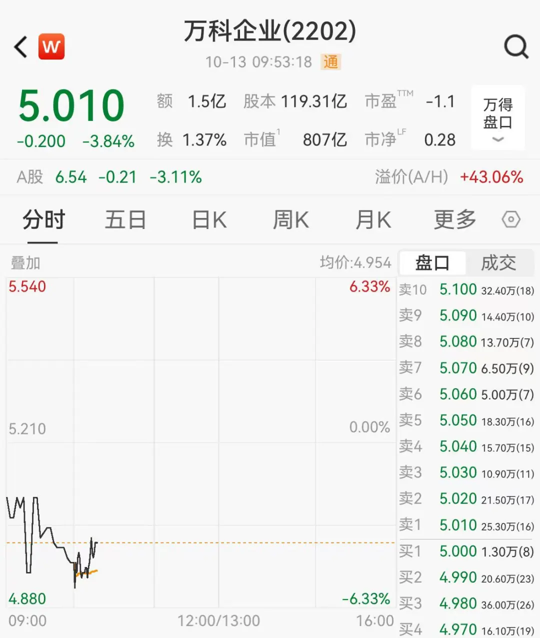 截至9:53,港股万科企业跌3.84%,最新报5.01港元/股;A股万科A跌3.26%,报6.53元/股。